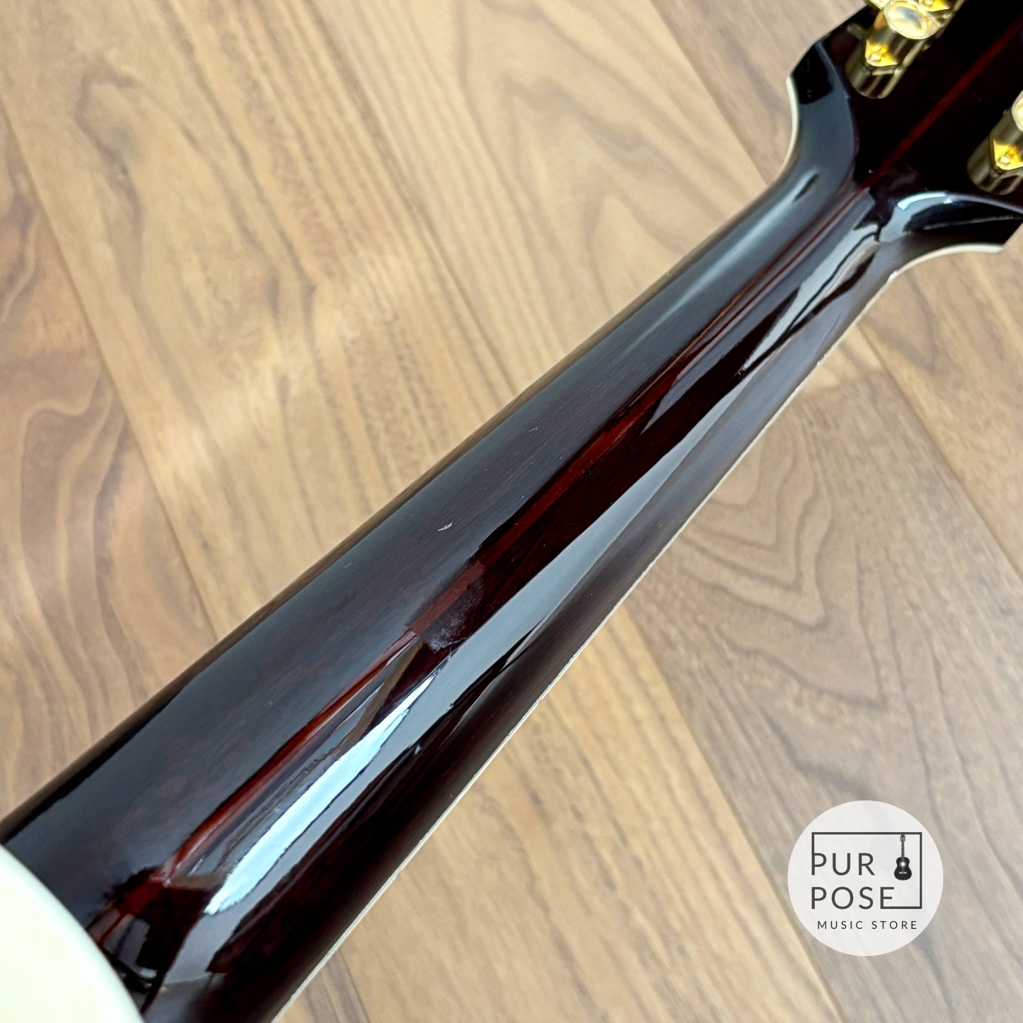 サイドにクラック(写真の赤丸箇所)がございましたが、パッチ処理を含むリペアを施しております。構造的な問題はなく、サウンドへの影響も一切ありません。