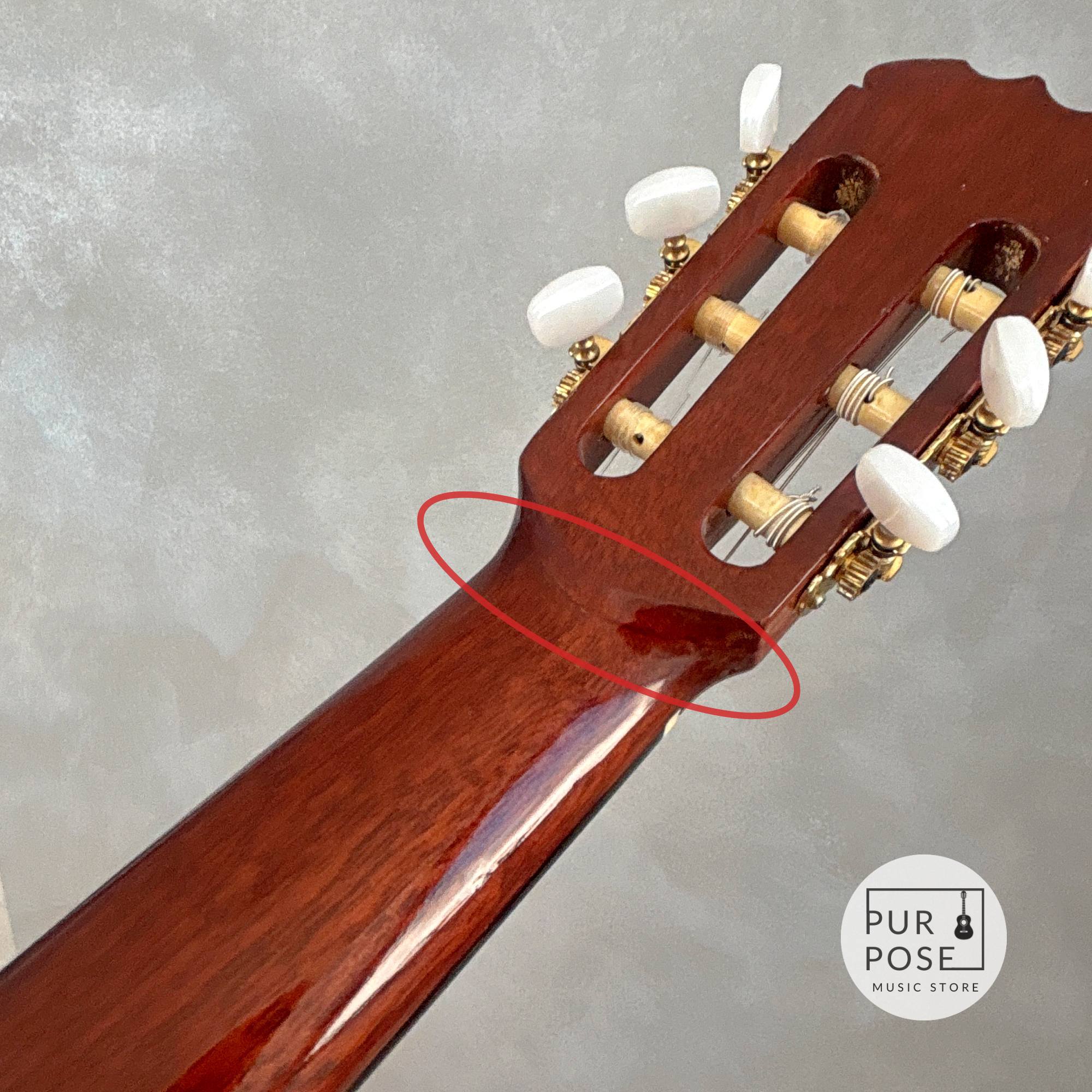トップおよびネックの一部にクラック(亀裂)がございましたが、当店にて細部まで徹底したリペアを施しております。修理後にはオーバーラッカー仕上げを行いましたので、画像(赤丸箇所)でご確認いただかない限り、パッと見では気づかないほど美しく、滑らかに蘇っています。もちろん外観の復元だけでなく、楽器としての強度・振動伝達も十分に考慮して仕上げておりますので、安心してお使いいただけます。